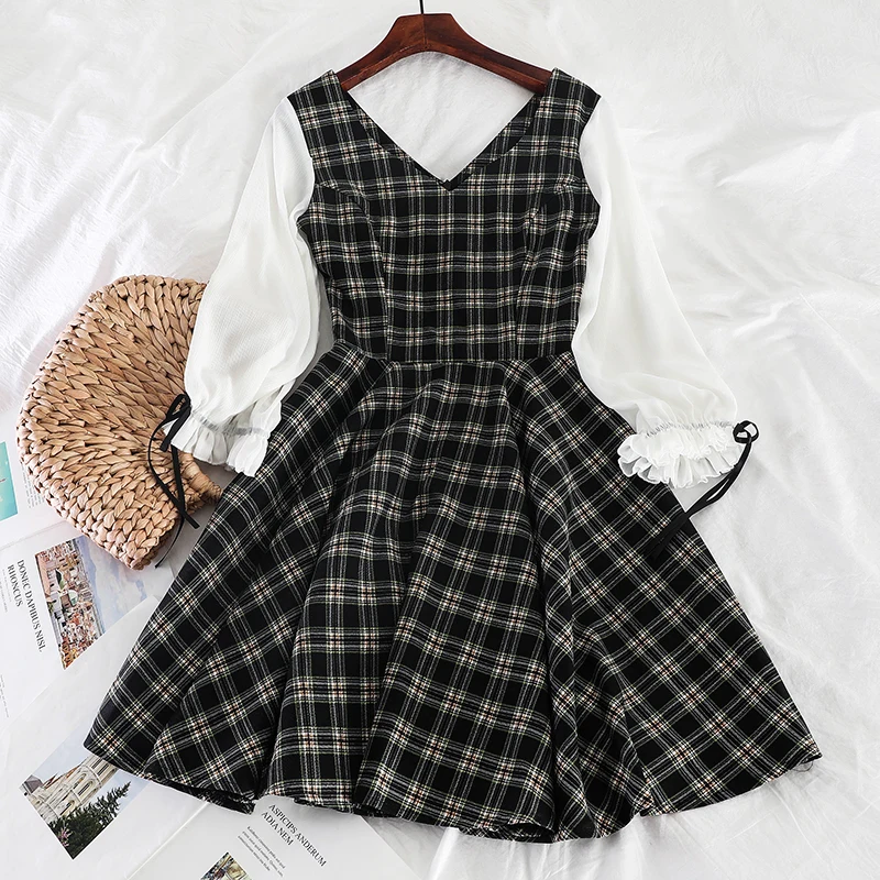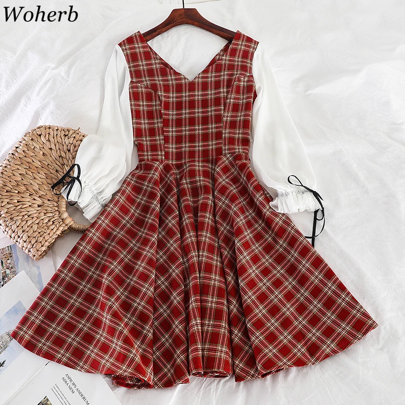 Limited Chance of Woherb Japanese Harajuku Plaid Dress Women Autumn Long Sleeve Lolita Style Student's Dress Sweet Ka