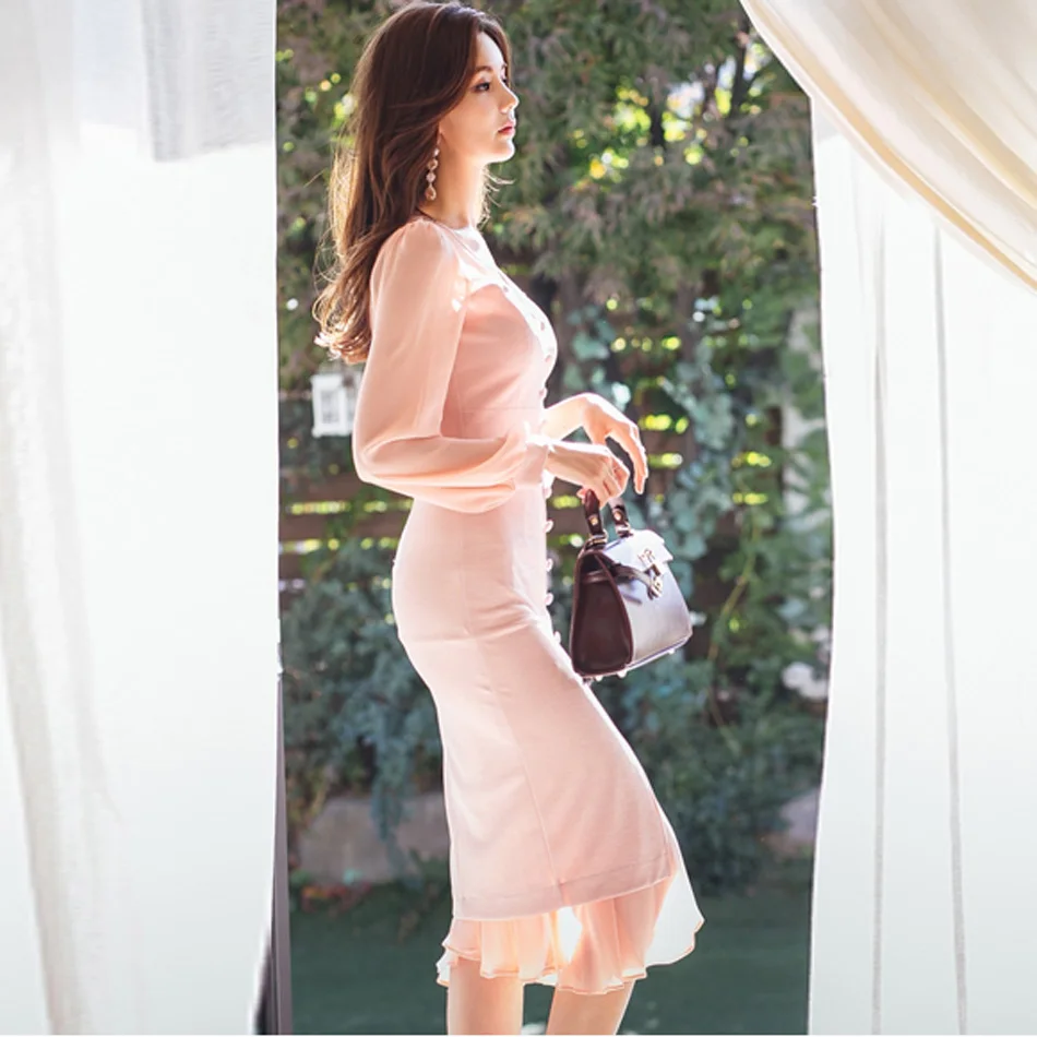 Temperament office dress square collar single-breasted chiffon stitching long-sleeved bag hip slim dress 2019 spring party dress
